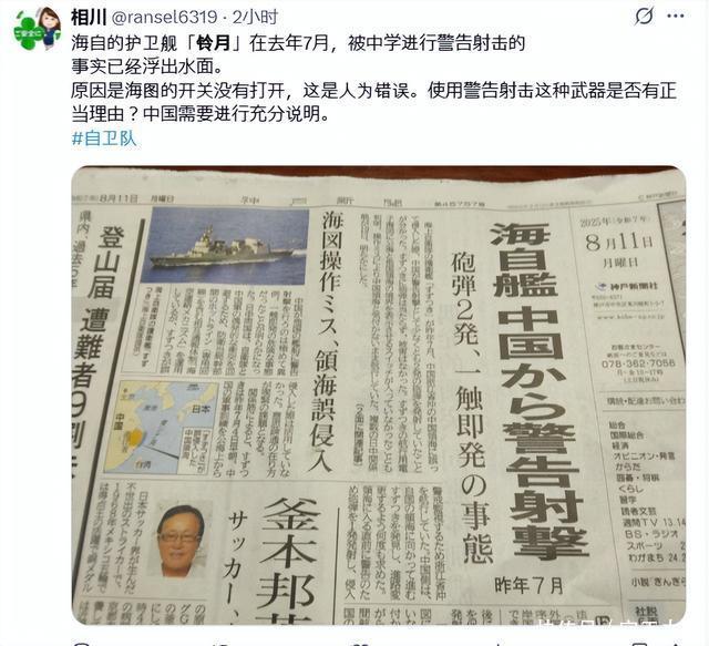 近日,据日本媒体“共同社”报说念,客岁擅闯我国领海,并最终被驱离的日本“凉月号”斥逐舰,确凿还“另有隐情”。按照日媒的说法,在屡次申饬被无视后,中国舟师对“凉月号”斥逐舰进行了两次申饬性射击,尽管“凉月号”并未受到执行毁伤,但其心情受到的轰动可思而知。音讯一出,有日本网民顺利炸锅,思对中方“倒打一耙”。