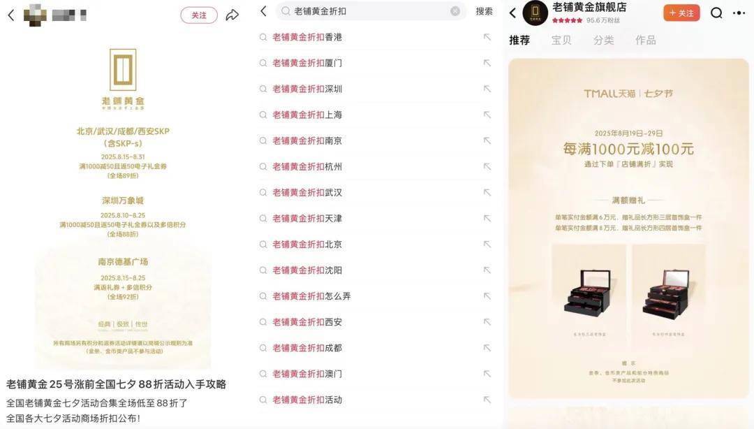 左近七夕,多地SKP市集、深圳万象城和南京德基广场的老铺黄金都推出了不同进度的行径,优惠幅度在88-92折之间,线上官方旗舰店也有“每满1000-100元”的行径。记者了解到,老铺黄金的扣头频繁出当今新店开业、市集行径和平台大促技术。有市场不雅点质疑,打折会折损品牌的价值和魄力。