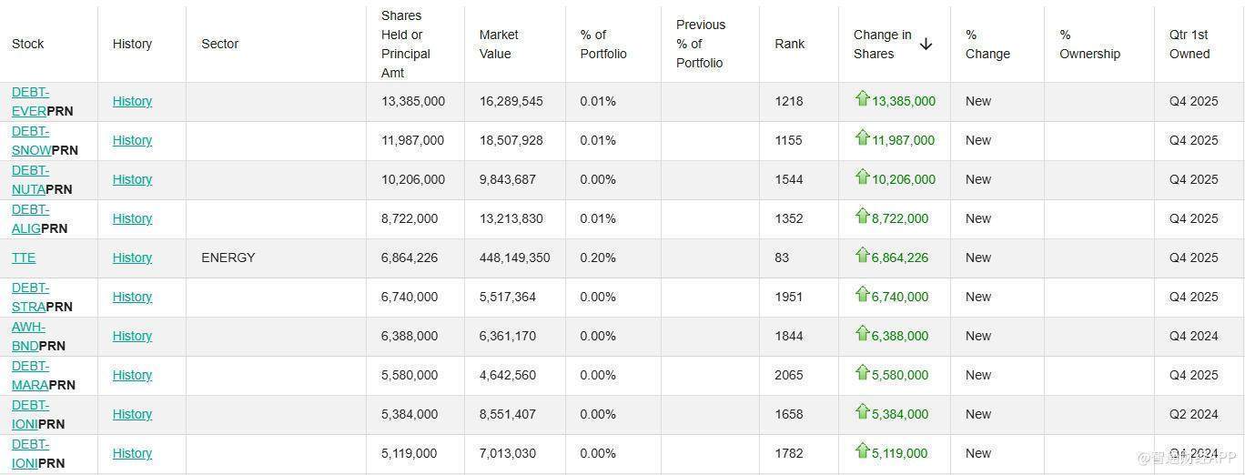 从新建仓情况来看,花旗在第四季度新增了多项债务类及可退换证券干系抓仓。其中,新纳入的意见包括西星动力(EVRG.US)、Snowflake(SNOW.US)、Nutanix(NTNX.US)、艾利科技(ALGN.US)、Mara Holdings(MARA.US)、IonQ Inc(IONQ.US)等公司的干系债务或优先证券,单一意见新增规模无数在梗概500万至1300万份区间,全体占投资组合比例相对有限。
