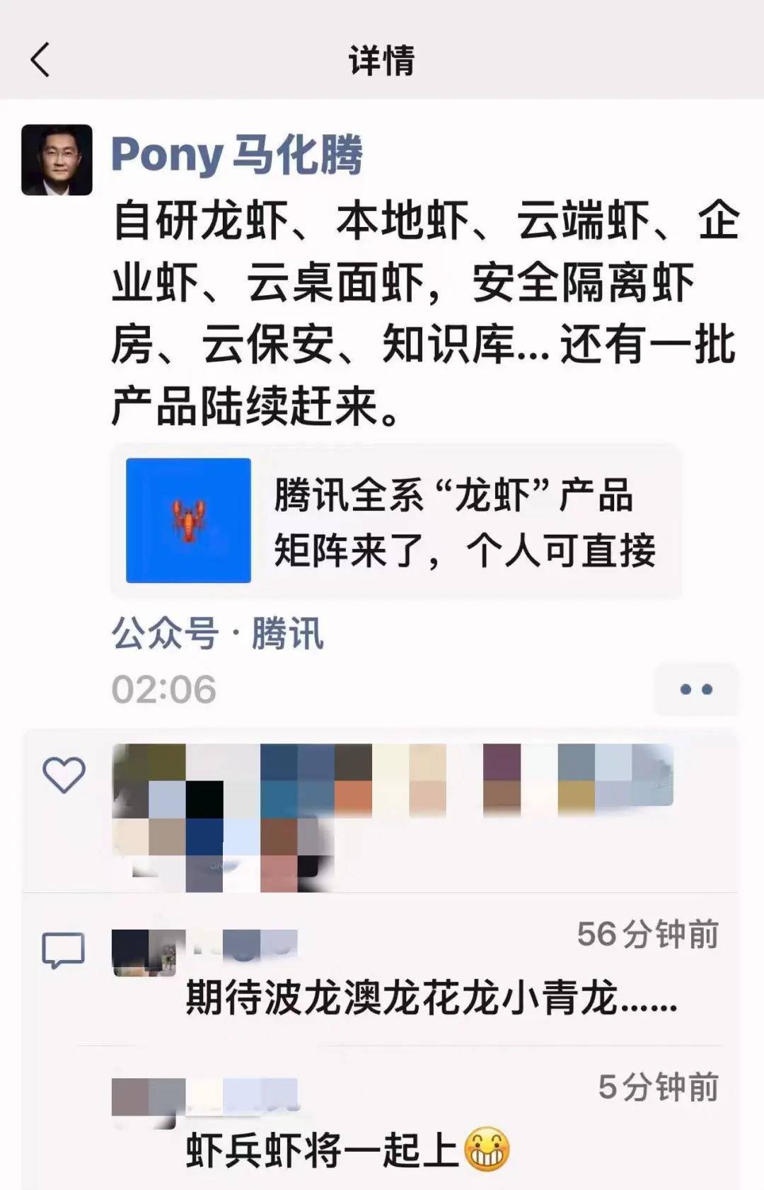 3月11日开云kaiyun,第一财经记者了解到,腾讯董事会主席兼首席实施官马化腾本日凌晨2:06在一又友圈转发了腾讯推出全系“龙虾”居品矩阵的公众号著述,并配文“自研龙虾、土产货虾、云表虾、企业虾、云桌面虾,安全结巴虾房、云保安、常识库......还有一批居品络续赶来”。