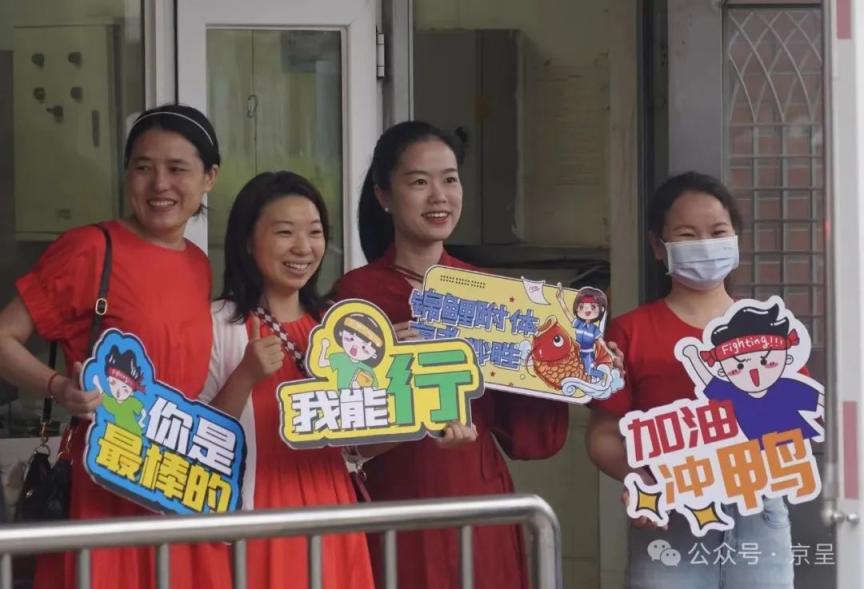 北师大附中考点前,敦厚手捧“考的王人会”口号送考。 白继开 摄