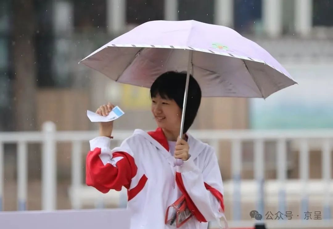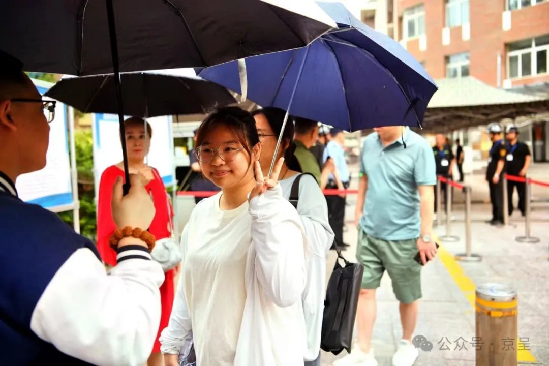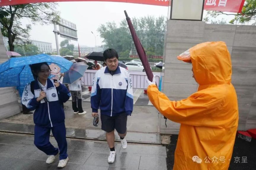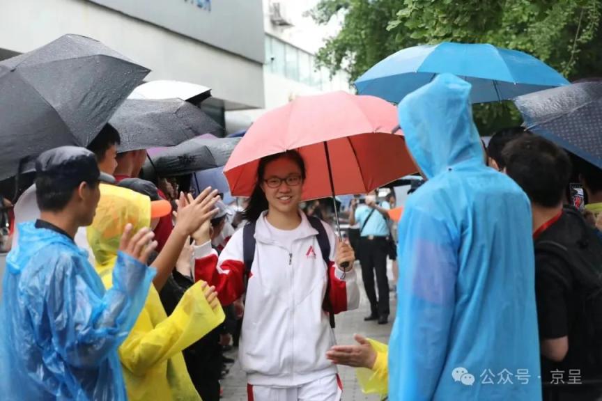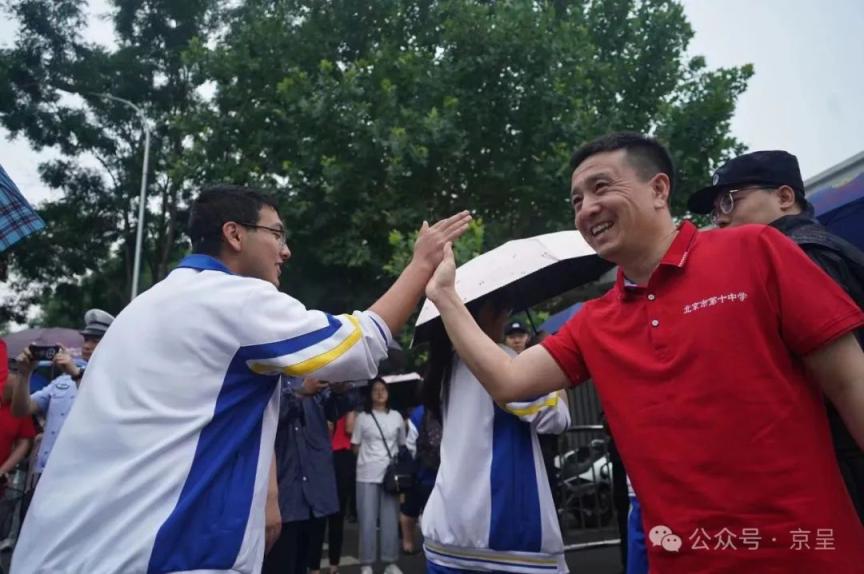 北京东谈主大附中考点,考生在雨中走过送考东谈主群,吸收击掌加油。 甘南摄