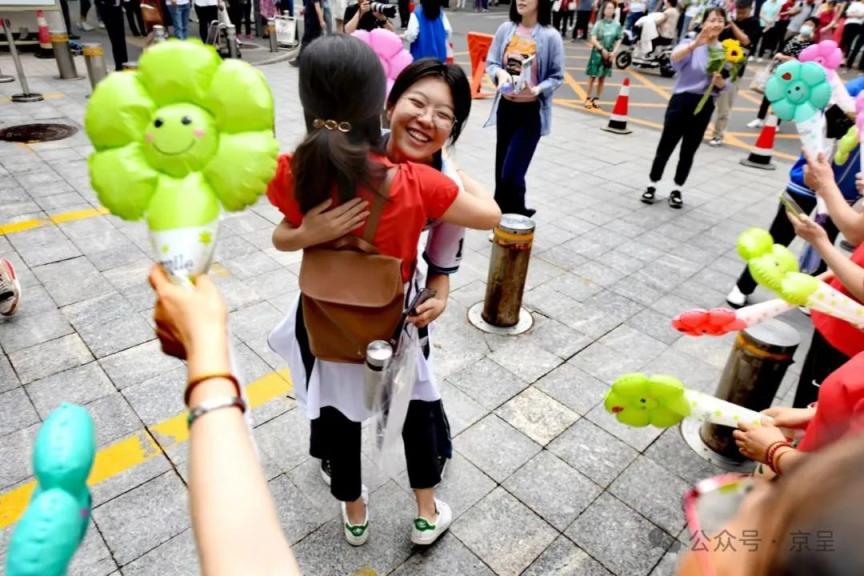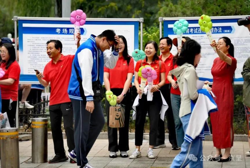 北京十八中考点,送考敦厚用曙光花气球轻拍学生,寓意将“好运”传递。和冠欣摄