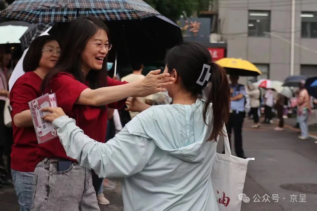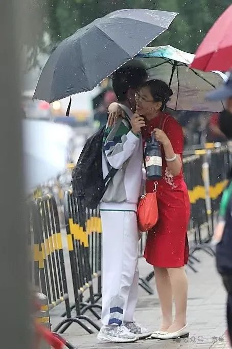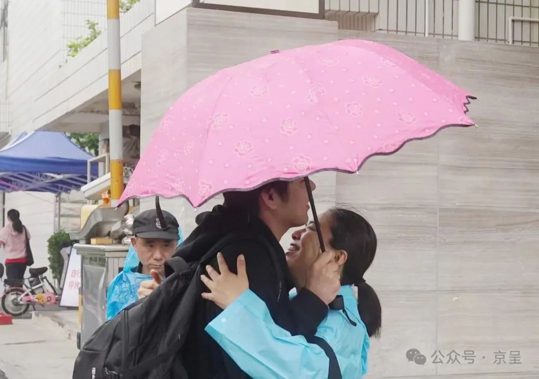 北京东谈主大附中考点前,雨中送考家长与考生拥抱奉上道喜。甘南摄