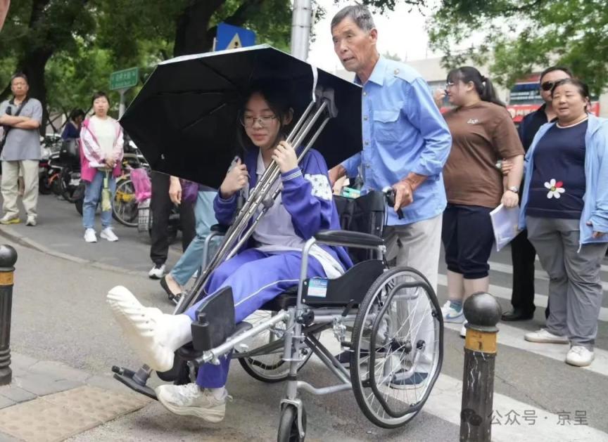 北京广渠门中学考点外,别称行径未便的考生坐轮椅由家长实行到考点外准备参加科场。 刘平 摄