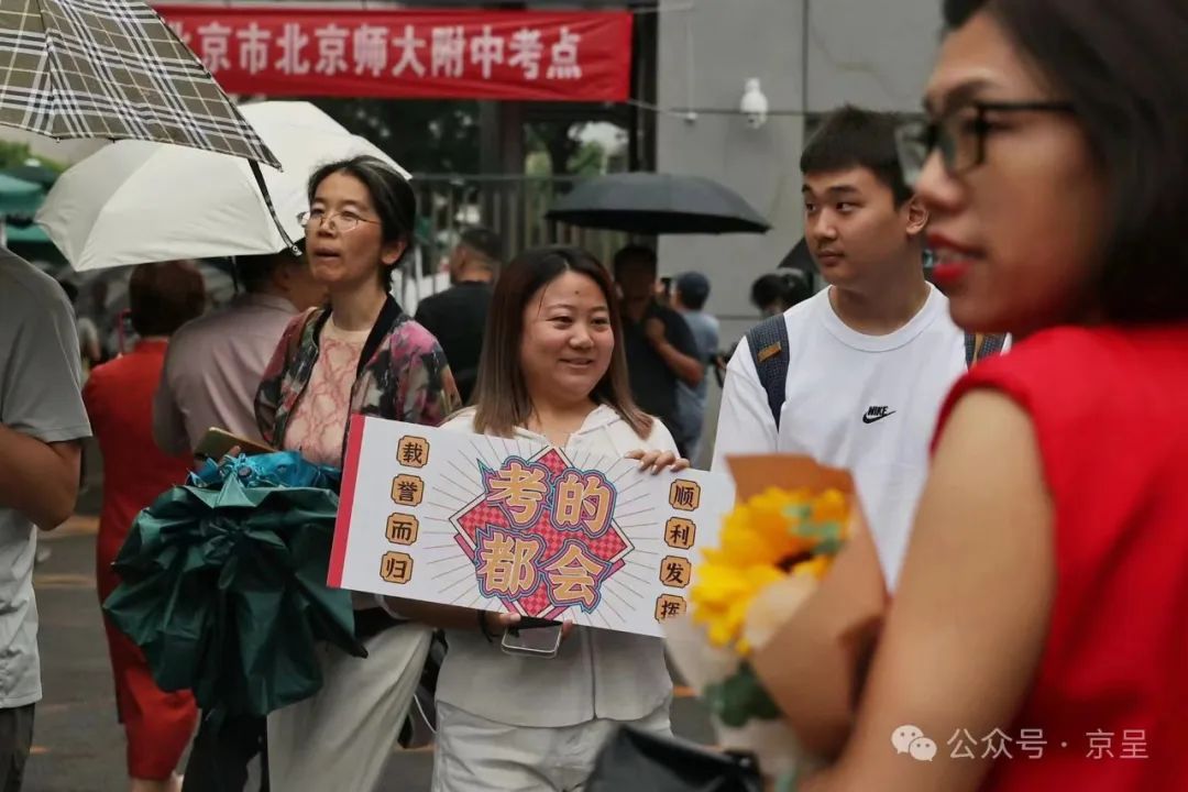 北师大附中考点前,敦厚冒雨送考,为考生奉上道喜。 白继开摄