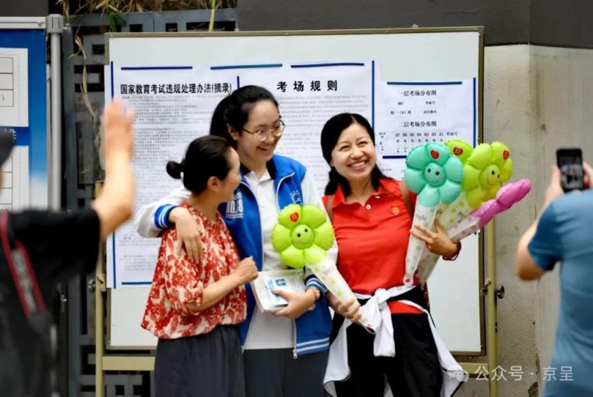 北京十八中考点,考生、家长和送考敦厚面带笑颜合影。和冠欣摄
